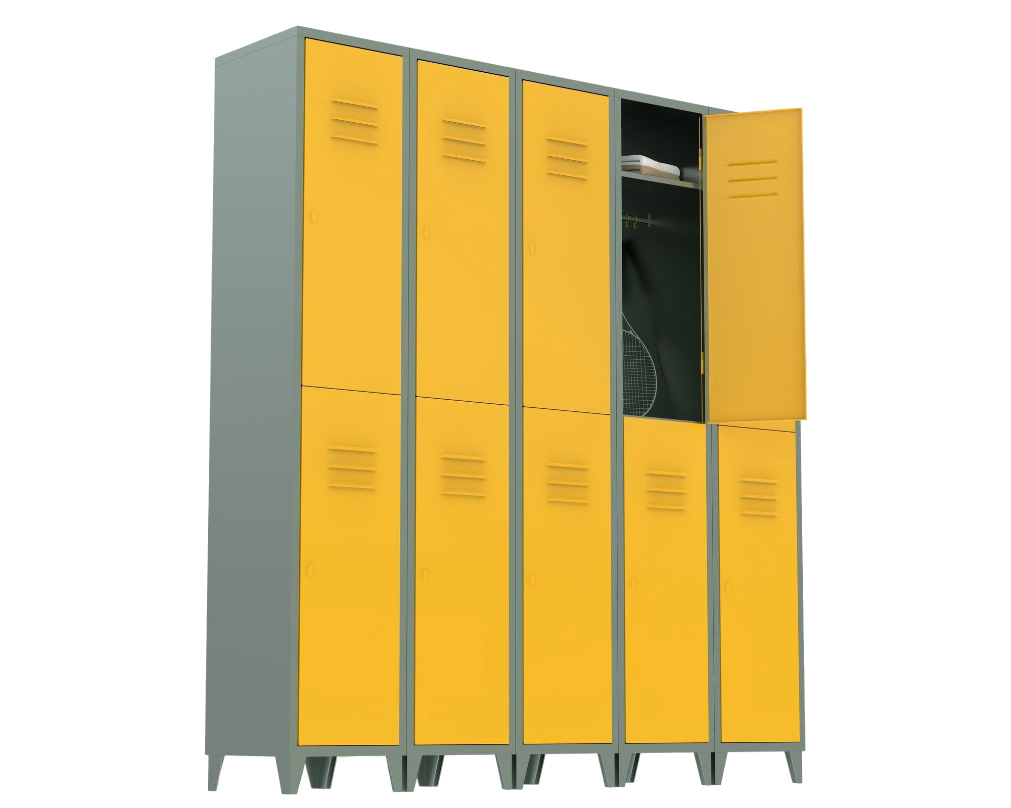 - Modular Design: Lockers are banked together, sharing side walls to save space and materials.
